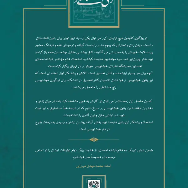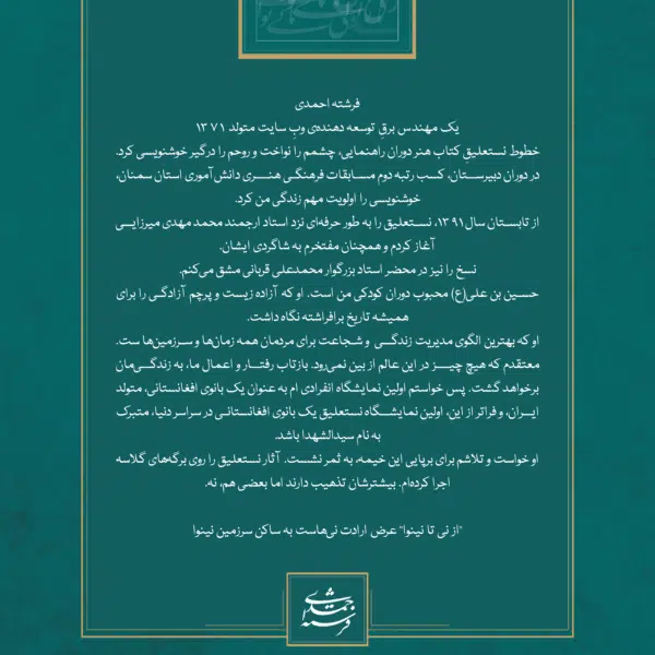 پس خواستم اولین نمایشگاه انفرادی ام به عنوان یک بانوی افغانستانی، متولد ایران، و فراتر از این، اولین نمایشگاه نستعلیق یک بانوی افغانستانی در سراسر دنیا، متبرک به نام سیدالشهدا باشد.